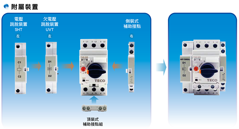 ●附屬裝置:頂裝式補助接點組、側裝式補助接點組、電壓跳脫裝置、欠電壓跳脫裝置