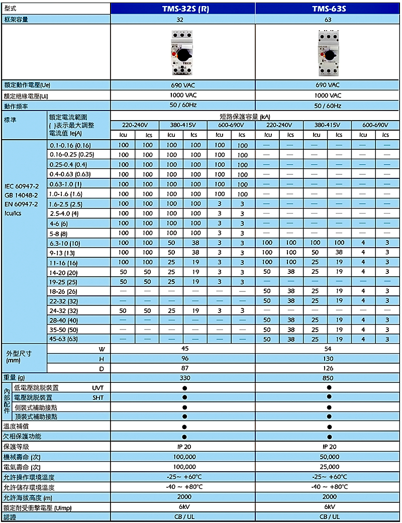 東元TMS-32S手動馬達啟動器系列產品,兼具斷路器的短路保護、線路保護功能及熱動過載電驛的過載保護、欠相保護、額定電流可調整以及環境溫氷自動補償功能,且整體組化設計更加便利於生產與應用。