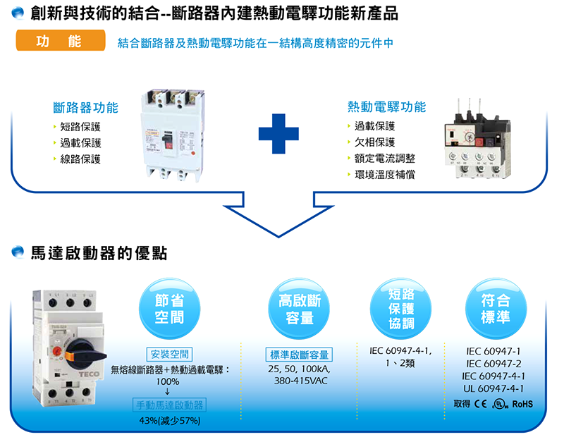 東元手動馬達啟動器系列產品,兼具斷路器的短路保護、線路保護功能及熱動過載電驛的過載保護、欠相保護、額定電流可調整以及環境溫氷自動補償功能,且整體組化設計更加便利於生產與應用。